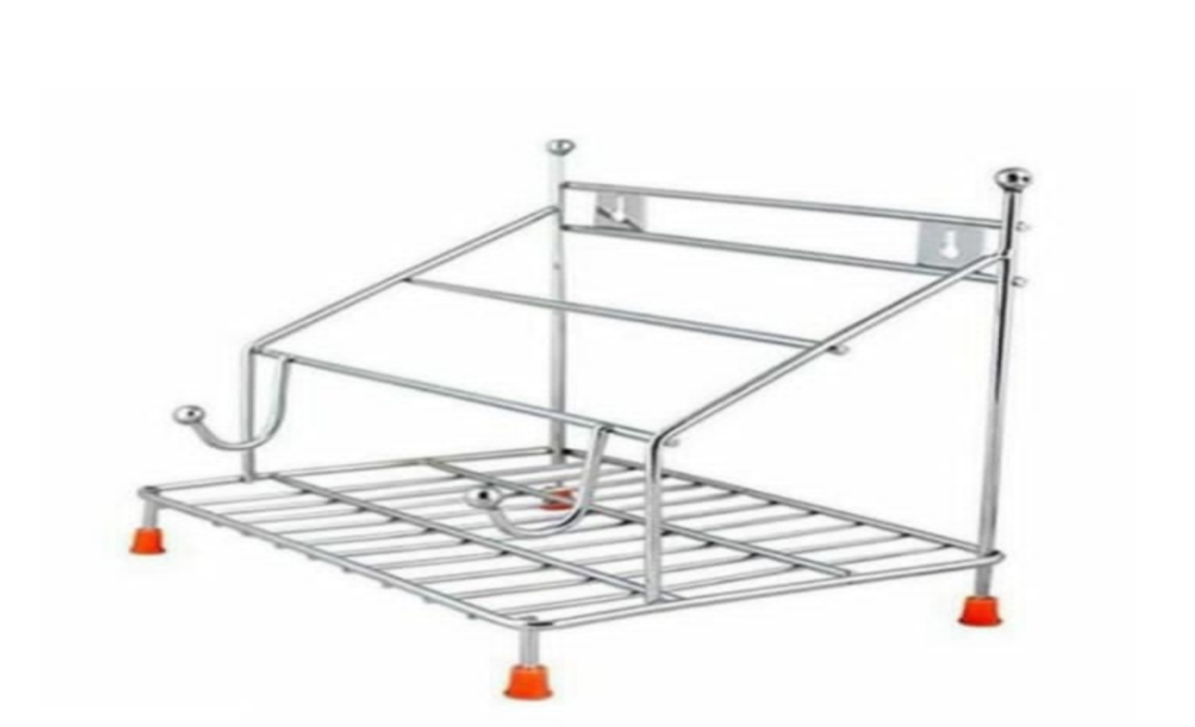 a metal dish rack with a white background, suggesting it is a product photo for an online store or catalog. The dish rack features a rectangular base with multiple horizontal bars and two vertical bars on either side, each topped with a hook. Four orange feet are attached to the bottom of the rack, providing stability and protection for countertops.